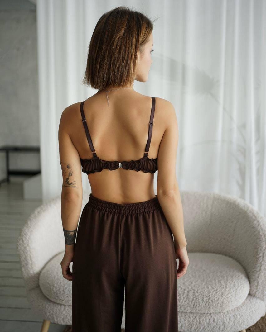 Set includes: a robe with wide sleeves, a comfortable bodice without cups with an elastic base with a fastener and loose-fitting long pants with slits in the front.