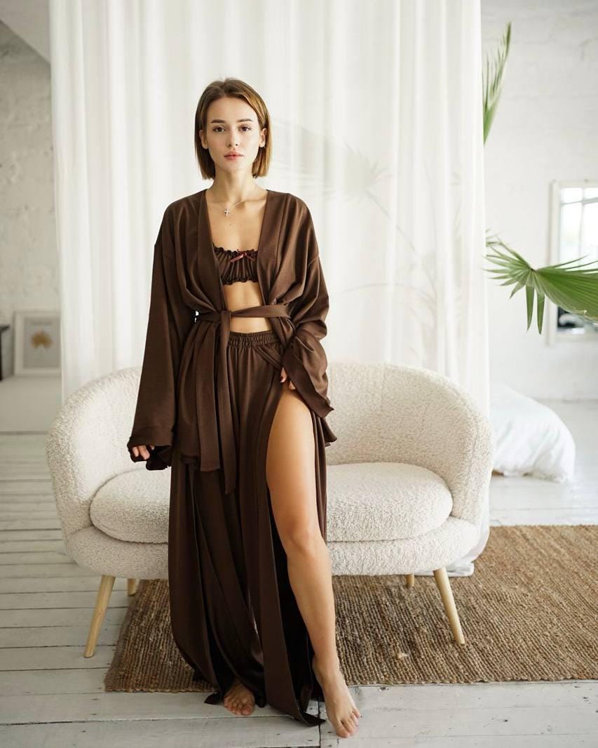 This is a vivid example of how you can dress stylishly, and most importantly, comfortably, not only on the street but also at home.