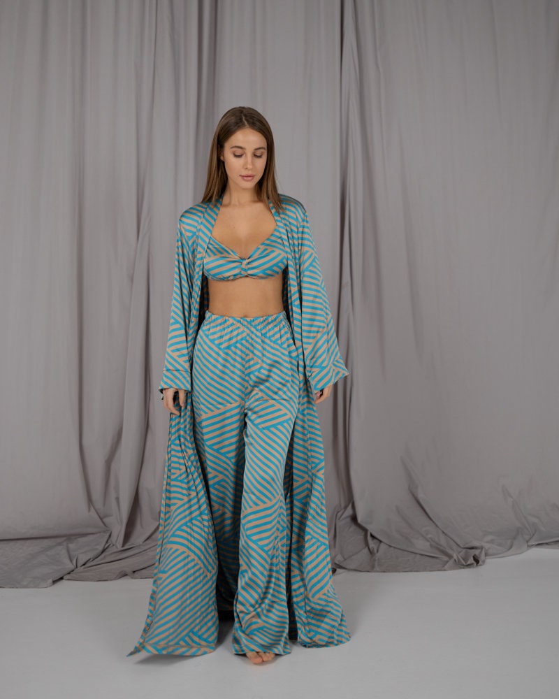 Set: long maxi dressing gown, bodice with a clasp without cups and long loose flared pants with an elastic band.